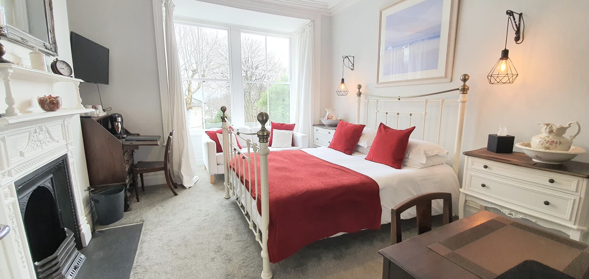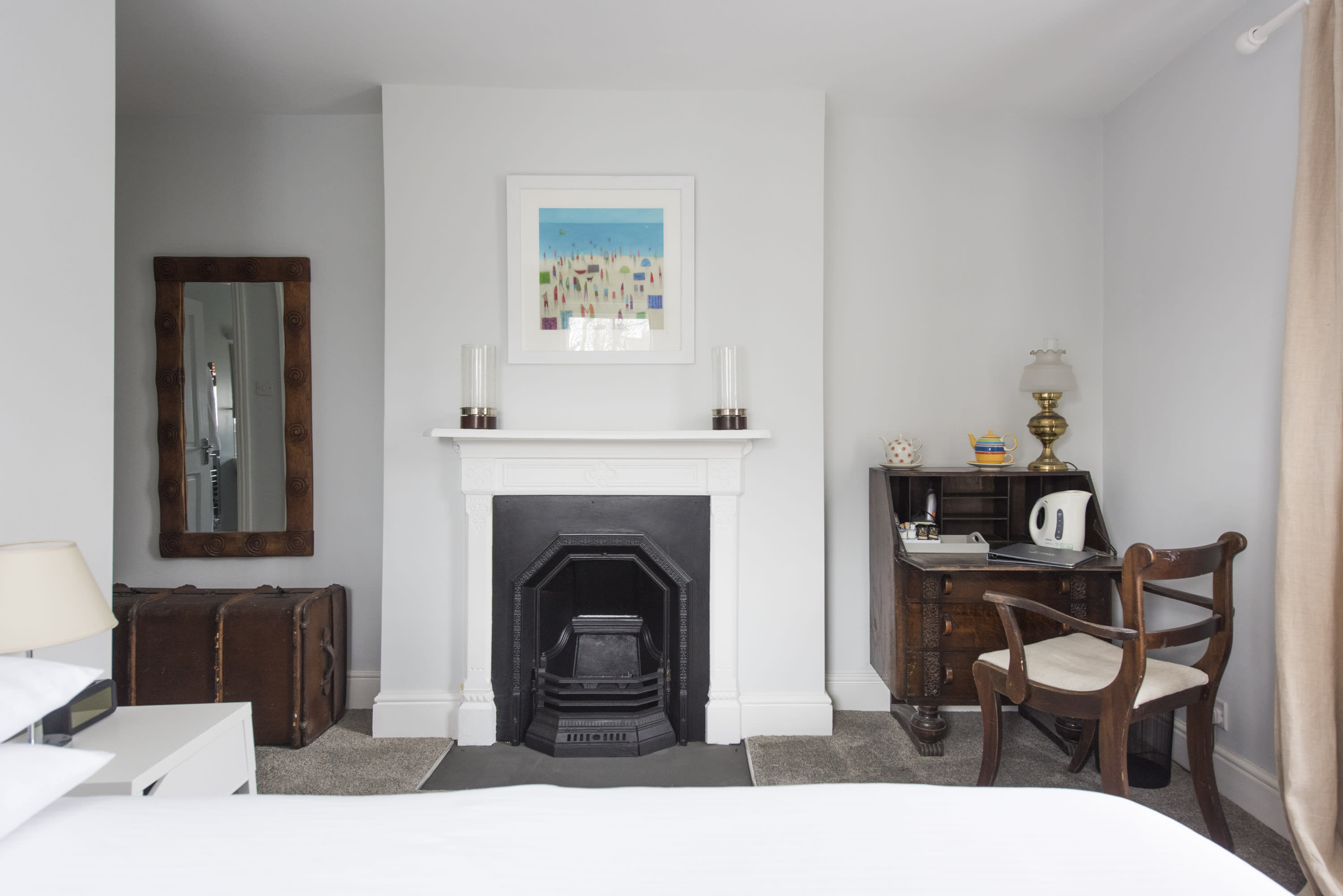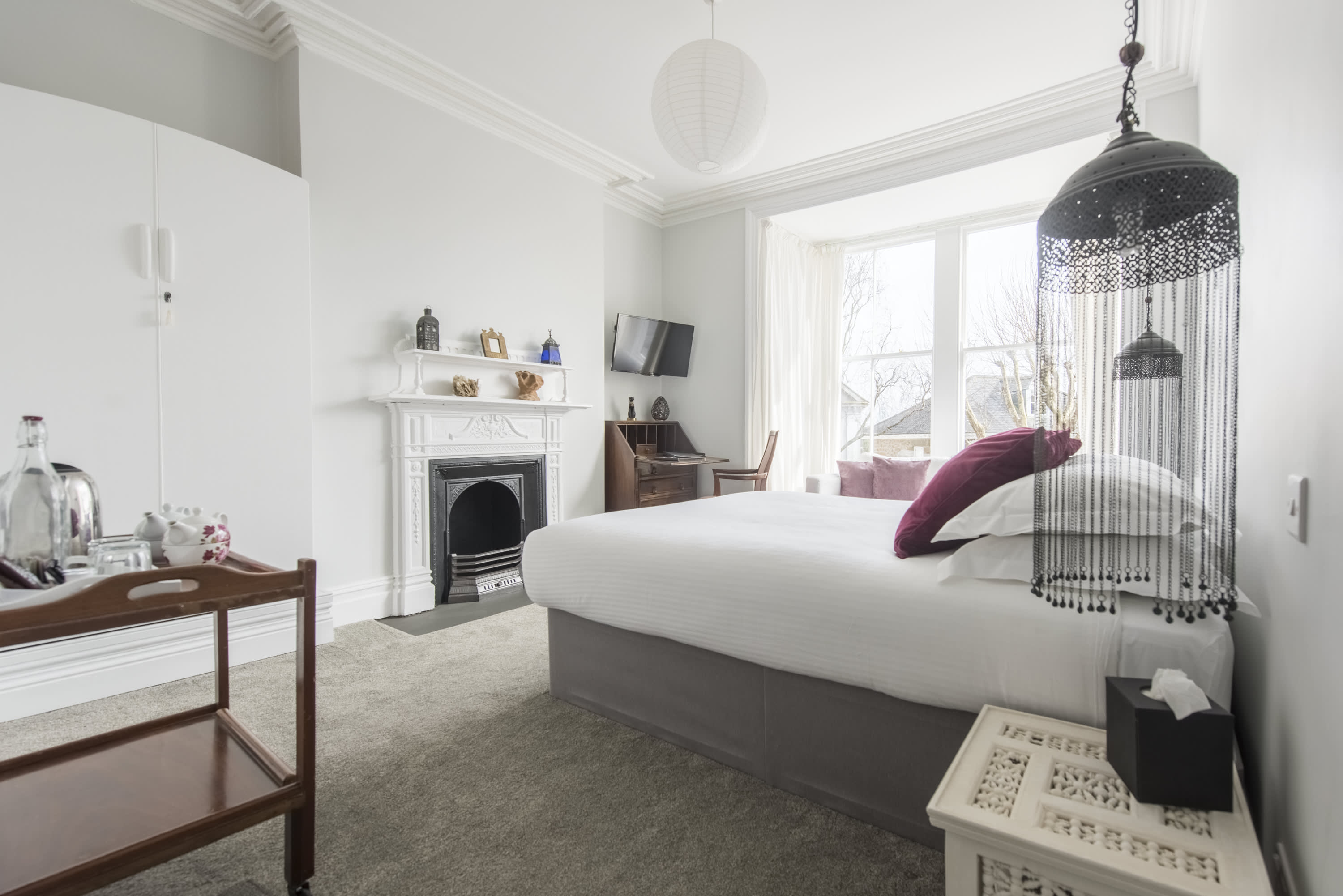 Our superior Double room is situated on the first floor at the front of the house with a glorious double bay window overlooking Alexandra Road. It comes complete with flat screen TV, guest amenities tray, alarm clock, hair dryer, desk and standalone wardrobe. The modern on suite bathroom offers a powerful shower, heated towel rail and a selection of skincare toiletries.Room Facilities: