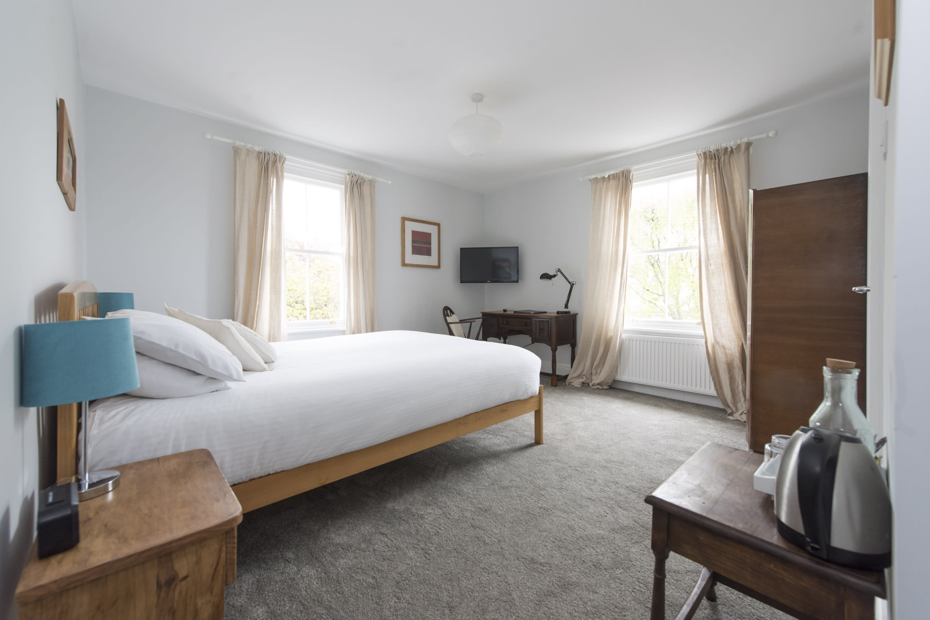 Our deluxe Double room is situated on the first floor on the side of the house with a large double bay window overlooking the garden. This beautiful, bright and spacious room is filled with traditional and eclectic features. It comes complete with flat screen TV, guest amenities tray, alarm clock, hair dryer, desk and standalone gentlemans’ wardrobe. The modern on suite bathroom offers a powerful shower, heated towel rail and a selection of skincare toiletries.Room Facilities: