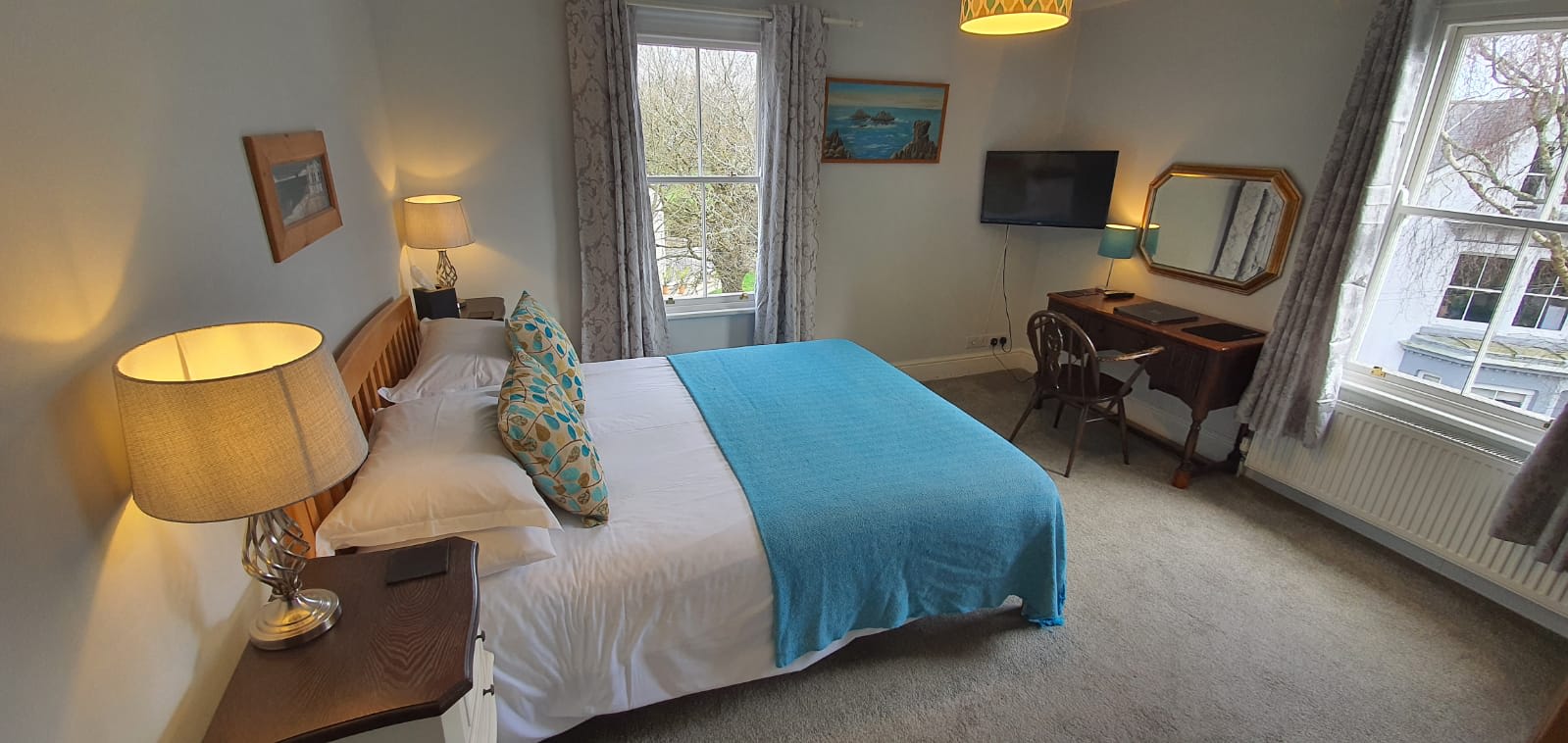 Our large Double room is situated on the second floor at the back of the house with a pretty view up the tree lined Trewithen Rd towards Penlee Park. It comes complete with flat screen TV, guest amenities tray, alarm clock, hair dryer, desk, and built in wardrobe. The spacious and modern on suite bathroom offers a powerful shower, heated towel rail and a selection of skincare toiletries.Room Facilities: